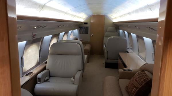 - Airplane cabin has 4 single swivel reclining seats and 2 person and 3 person side facing sofas. Total 10 passenger seating.